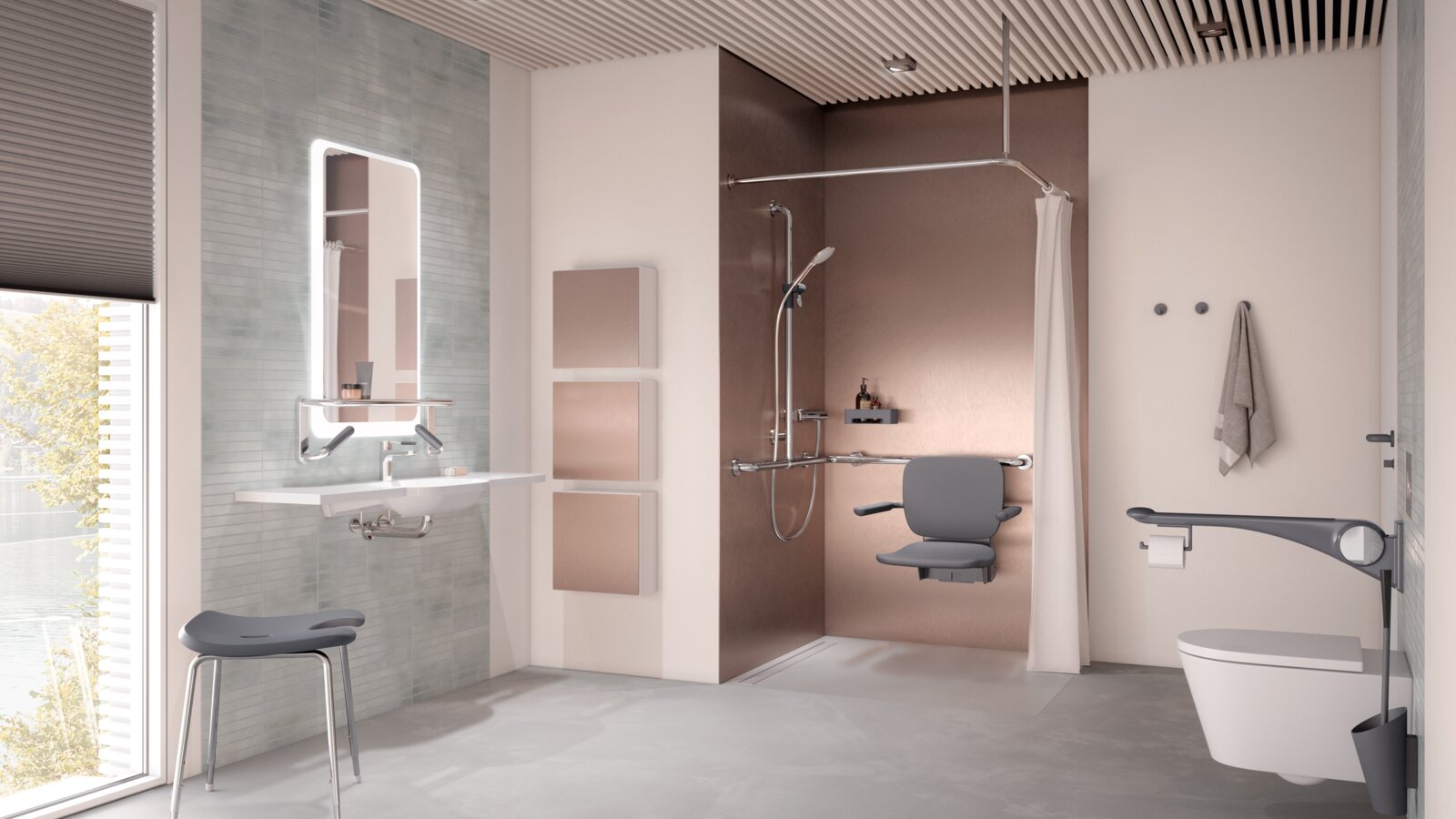 Eine zukunftssichere Badplanung sieht Montagevorbereitungen für Hilfsmittel wie Stützklappgriffe oder Duschsitze bereits in der Bau- oder Sanierungsphase vor – auch dann, wenn sie zunächst nicht installiert werden. HEWI bietet hierzu Systeme wie System 900, bei denen Haltevorrichtungen stilvoll vorgerüstet und bei Bedarf jederzeit ergänzt werden können.