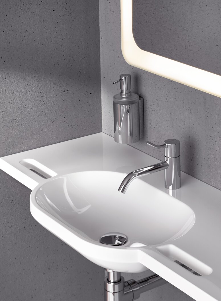 Das modulare Waschtischsystem ist die Antwort von HEWI auf den demografischen Wandel. Besonders in Bezug auf Architektur und Produktlösungen gewinnen innovative Konzepte immer mehr an Bedeutung. Mit dem modularen Waschtischsystem ist der Waschtisch über weitere Produkte, die wichtige Zusatzfunktionen bieten, ergänzbar. Das System ermöglicht die Integration eines adaptiven Haltegriffs, der gleichzeitig als Handtuchhalter dient sowie eines modularen Ablagesystems direkt am Waschtisch. So ist gewährleistet, dass alle Badutensilien in greifbarer Nähe ihren Platz finden.