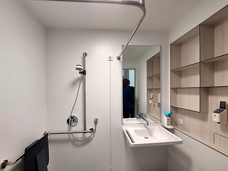 Eigene Bäder für alle PatientInnen, fugenlose und leicht zu reinigende Nachttische mit schmutzabweisenden Oberflächen, automatisierte Reinigungskonzepte, Desinfektionsmittelspender, die bei Benutzung einen Smiley zeigen: So könnte das „Patientenzimmer der Zukunft“ aussehen. Der begehbare Demonstrator eines solchen Zweibettzimmers wurde am 31. August 2022 auf dem Gelände des Städtischen Klinikums Braunschweig eröffnet. In dem Forschungs- und Studienlabor entwickeln Expert*innen aus den Bereichen Architektur, Materialforschung und Medizin praxistaugliche Musterlösungen für die Krankenhaus-Architektur. Dafür haben sich die Technische Universität Braunschweig, das Fraunhofer-Institut für Schicht- und Oberflächentechnik IST und das Städtische Klinikum Braunschweig zusammengeschlossen. Im Projekt eingebunden sind auch 19 IndustriepartnerInnen, darunter HEWI.