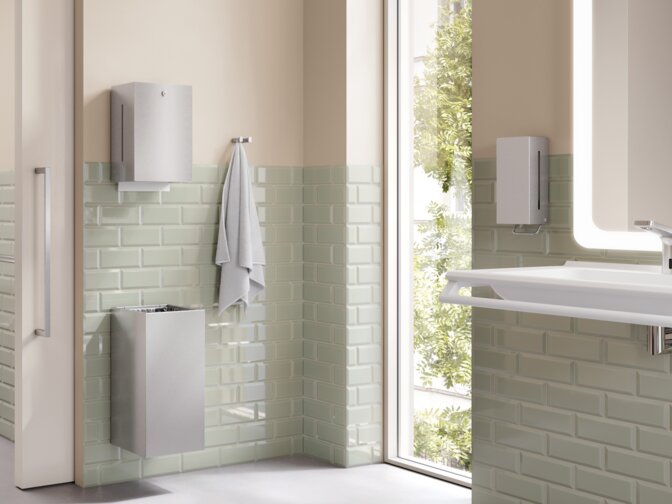From soap and paper towel dispensers to hygiene combinations and wastebins in various sizes, HEWI offers a coherent, functional assortment that combines the highest design standards with long-lasting quality.