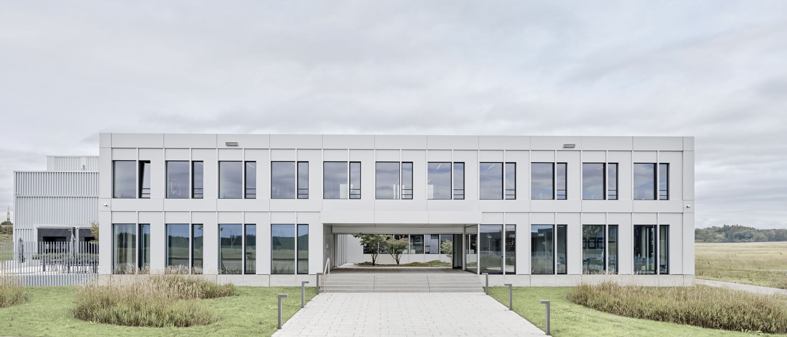 800 of the total 4800 square metres of floor space is used for administration. It is located at the head of the building, two storeys high, and is laid out around a green, park-like inner courtyard with a high welcoming qualities. The remaining 4000 square metres are required for production and storage space. The elongated hall, which directly adjoins the administration building, has two aisles. Slender reinforced concrete columns support the filigree steel structure.