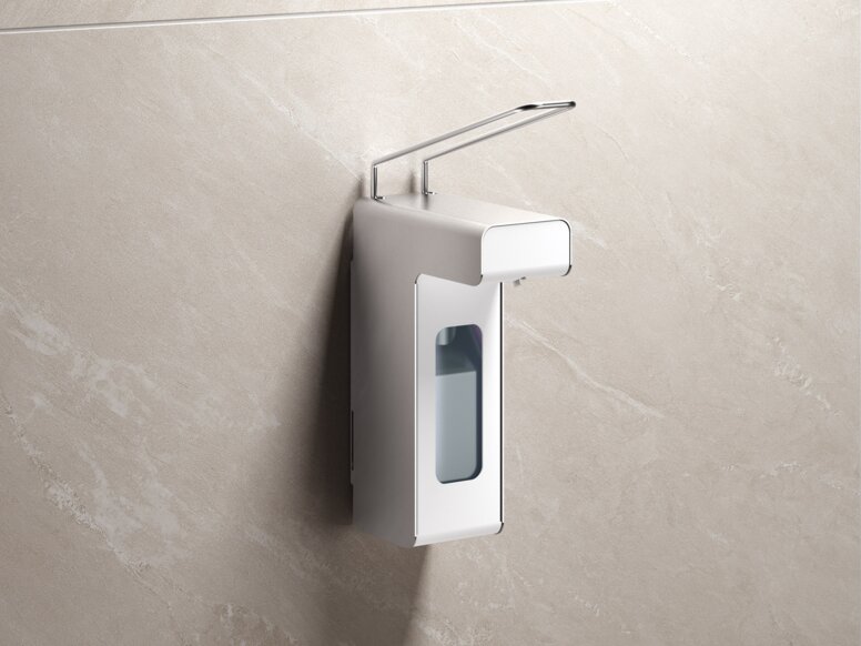 These dispensers are particularly suitable for nursing staff. Placed in hospital corridors or in patients’ rooms, they enable quick disinfection and easy cleaning of the surface beneath the dispenser. The sensor-controlled alternatives are particularly suitable for (semi-) public and highly frequented areas. Their touch-free use prevents the transmission of germs making them particularly hygienic. The illuminated dispensing area the product being dispensed and allows intuitive use of the dispenser.