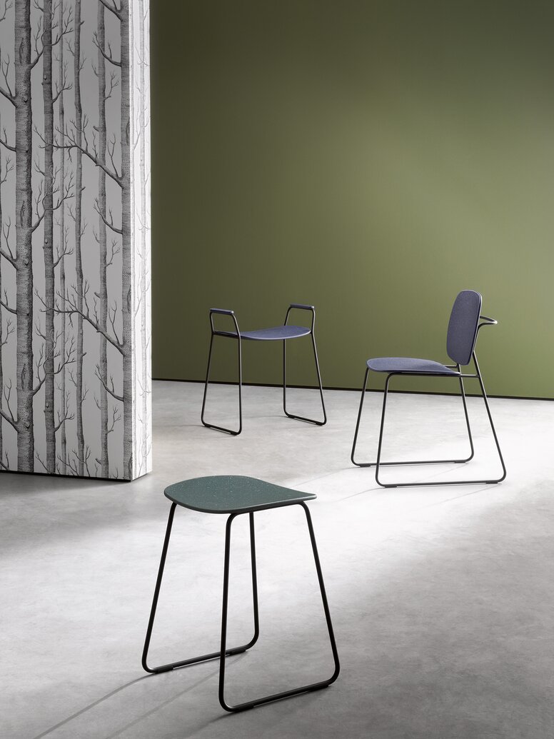 For HEWI, the charm lies in the fact that the recycled stools, made from a mixture of materials including recycled polypropylene and recycled polyamide, not only help to reduce plastic waste but also that each seat and armrest is unique. The slightly mottled surfaces with their unique patterns and translucent dots of colour have a vibrant and distinctive appeal.
