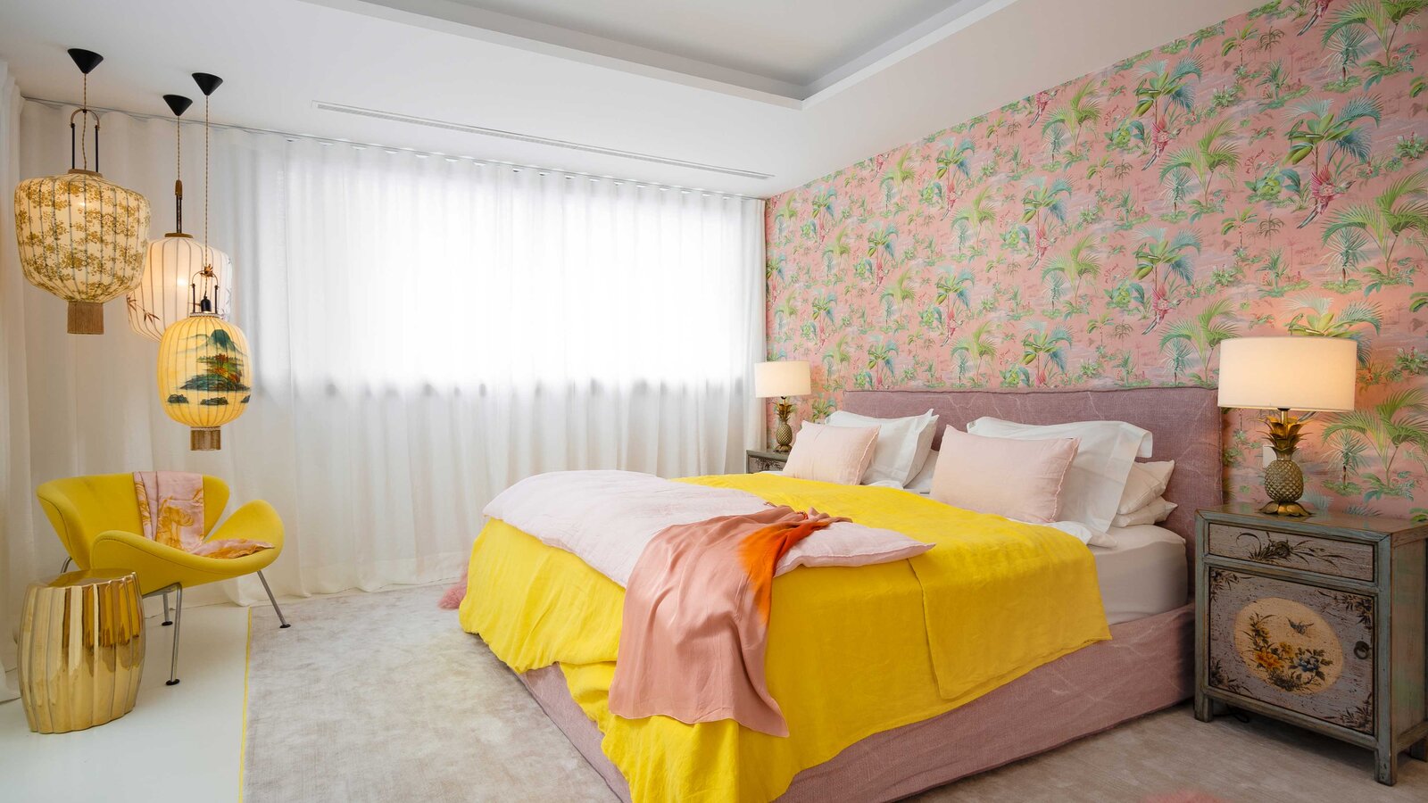 Leja’s designs focus on light, openness and, of course, colour – as the high-quality interior design of the house shows. Bright yellow, rich pink, red, and orange, and various shades of green – inspired by the surrounding Mallorcan nature – shape the character and stand for an carefree attitude towards life. A special feature is the combination of complementary colours such as purple on a yellow carpet or pink and red. These harmonise with each other in the highest luminosity.