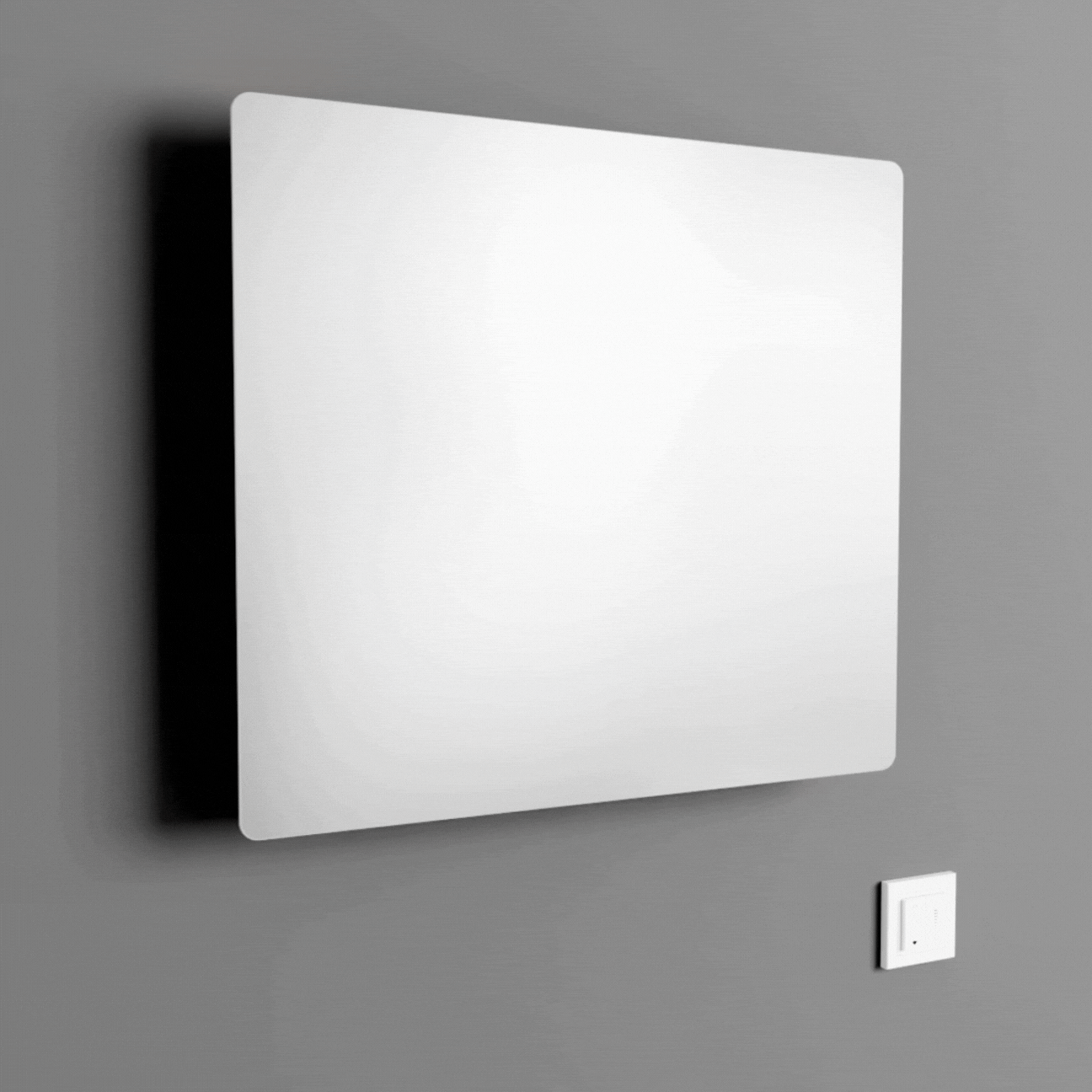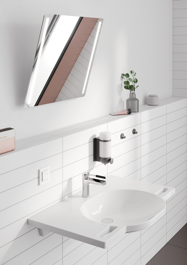The motorized tilting mirror extends the existing range of manual tilting mirrors. Equipped with an electric motor, the tilt function can be controlled up to a maximum of 28° via a freely positionable wireless wall switch. As with the manually operated adjustable mirrors, users can also choose between a non-illuminated and illuminated version. The separate wireless push-button is used to switch the lighting on and off and to continuously adjust the brightness and light color – from warm to cool white.