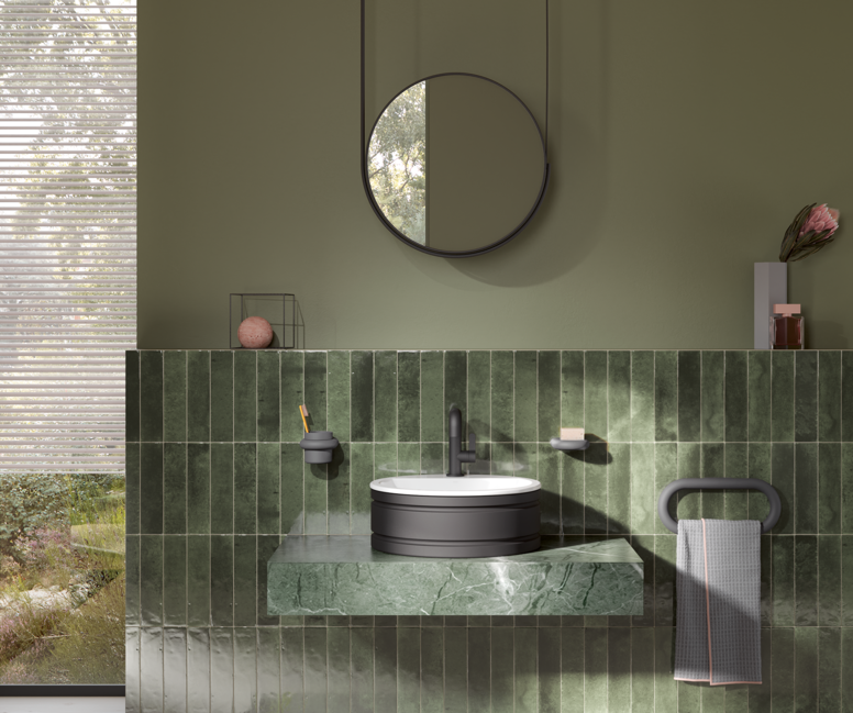 The innovative washbasin concept allows an adaptive support rail and a modular storage system to be integrated directly into the washbasin. It is available in three attractive powder-coated colours that blend harmoniously into different bathroom designs. The high-quality powder coating gives the washbasin an elegant look, makes the surface particularly resistant and ensures a comfortable grip on the support rail.