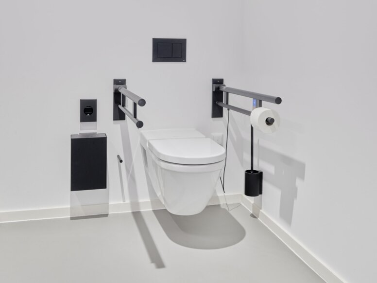 • Système 900 (distributeur de papier WC, ensemble de brosse WC, distributeur de produit désinfectant et de savon, distributeur de savon manuel, distributeur de produit désinfectant Sensoric, distributeur de serviettes en papier, poubelle à papier, distributeur de sacs hygiéniques, barres d’appui relevables)