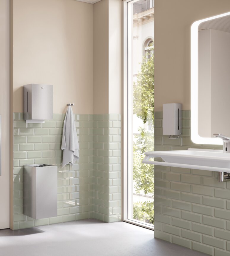 Des distributeurs de savon et d’essuie-mains en papier aux poubelles de différentes tailles, en passant par les combinaisons de produits d’hygiène, HEWI propose un assortiment cohérent et fonctionnel qui allie une qualité durable à des exigences élevées en matière de design.