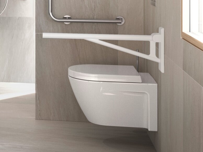 Handgrepen met scharnieren moeten ook aan beide zijden van het toilet worden aangebracht. De bovenkant van de opklapbare steungreep op het toilet moet 28 cm boven de zithoogte zitten. Het wordt ook aanbevolen dat de opklapbare steungreep 15 cm voorbij de zitting uitsteekt. Een vrije afstand van 65 tot 70 cm tussen de handgrepen wordt aanbevolen. Deze waarden zijn bedoeld voor de publieke sector. In privéwoningen is het belangrijk dat opklapbare steunrails achteraf kunnen worden aangebracht. Het installeren van een geschikte montageplaat bij het plannen van een nieuwe badkamer of het renoveren van een bestaande is een belangrijke beslissing voor de toekomst.