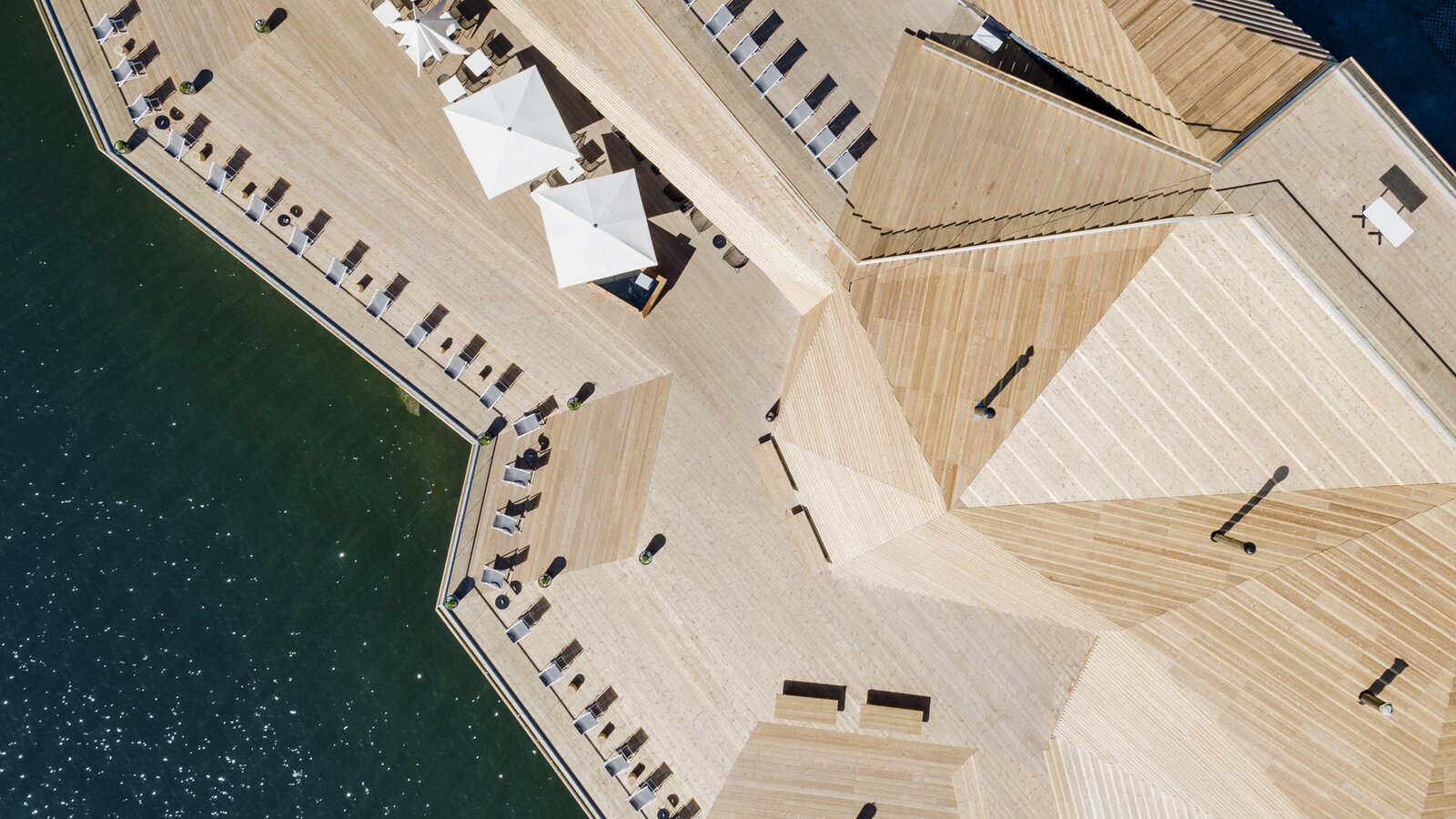 Ta czarna skrzynka jest otoczona muszlą z symetrycznie rozmieszczonych drewnianych rozpórek. Mają one kilka funkcji. Oferują one gościom ochronę przed niepożądanymi spojrzeniami. Ale nie ograniczajcie widoku z wnętrza do morza. W kierunku morza budynek spłaszcza się i oferuje gościom taras widokowy. Częściowo leży na wodzie, tak że słychać dźwięk morza pod stopami
