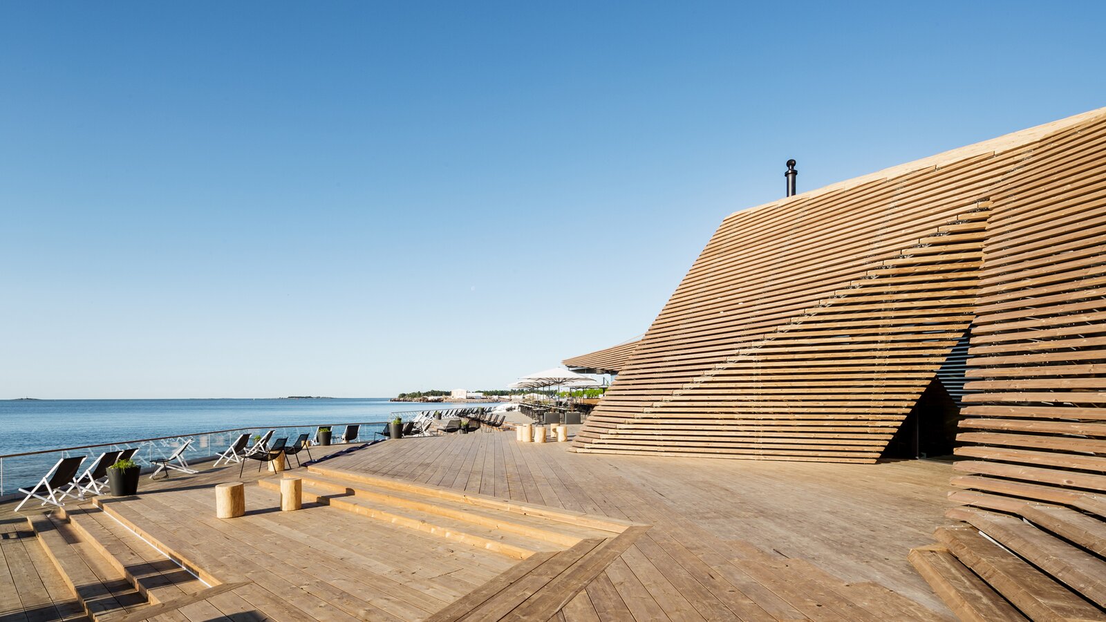 Tradycyjna sauna znajduje się w drewnianym budynku bezpośrednio nad brzegiem morza. Pagórkowata sylwetka sauny przypomina krajobraz wybrzeża Finlandii. Częściowo kanciaste kontury są również odzwierciedlone w umywalce HEWI Series 100 w bezbarierowym WC w saunie.