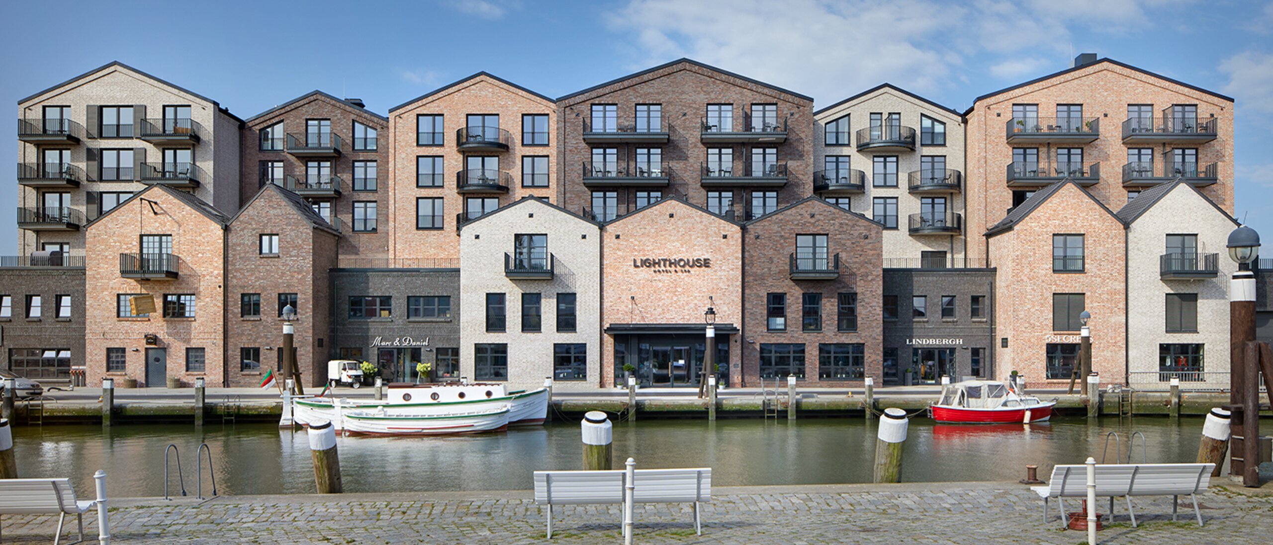 Duża kubatura budynku została podzielona na małe indywidualne struktury i oddaje typowy północnoniemiecki urok portowy. Dla obserwatora Lighthouse Hotel & Spa wygląda więc jak zespół różnych budynków, w którym oprócz hotelu mieszczą się trzy restauracje, sale konferencyjne, delikatesy, dwa sklepy i pub portowy.
