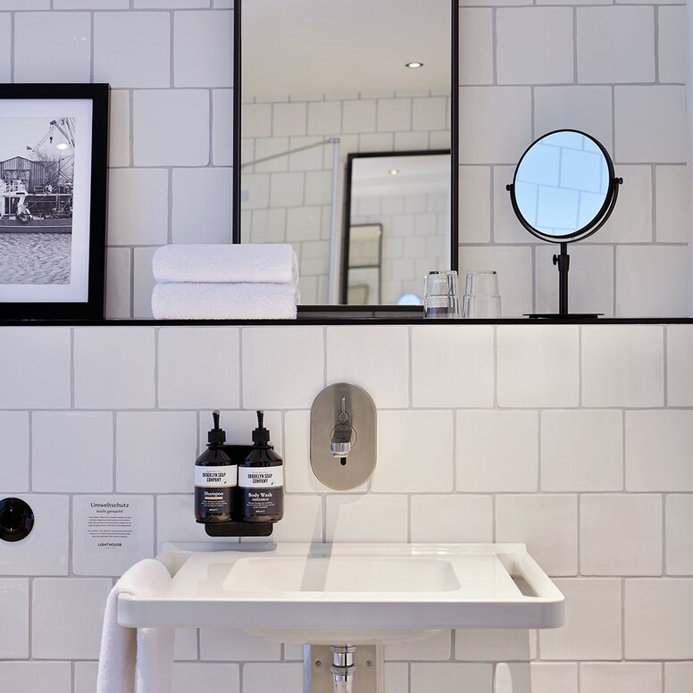 Czarny budynek i elementy wystroju biegną jak czerwona nić przez projekt hotelu. Rozwiązania HEWI System 900 harmonijnie integrują się z łazienkami hotelowymi i pomieszczeniami sanitarnymi bez barier.