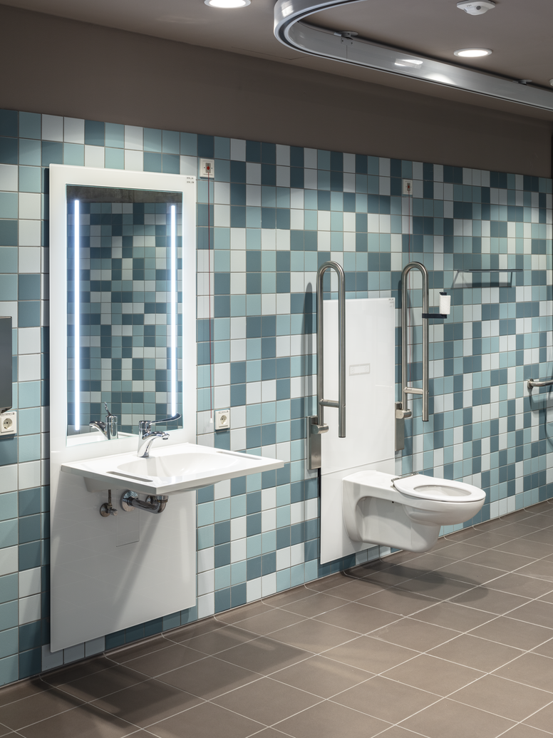 Szczególnie w newralgicznych miejscach pomieszczeń sanitarnych placówek oświatowych komfort i indywidualna możliwość użytkowania odgrywają ważną rolę. W pomieszczeniach sanitarnych szkoły Hans Thoma w Oberursel, rozwiązania firmy HEWI odpowiadają na różne potrzeby użytkowników. Moduły umywalkowe i WC można dopasować do odpowiedniej wielkości za pomocą pilota. Po naciśnięciu przycisku umywalka i WC ustawiają się na żądanej wysokości.